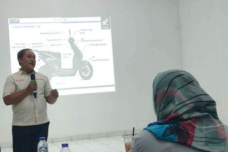 Dalam sesi berikutnya, Technical Training Honda Banten, Sularno, memberikan penjelasan mendalam mengenai berbagai komponen penting yang terdapat pada motor listrik Honda EM1 e:. “Motor ini dilengkapi dengan In-wheel Brushless Motor yang menghasilkan tenaga sebesar 1,7 kW pada 540 rpm, dengan torsi mencapai 90 Nm pada 25 rpm,” jelas Sularno. Ia juga menambahkan bahwa motor ini menggunakan baterai Lithium-Ion dengan tegangan 50,26 V dan kapasitas 29,4 Ah.