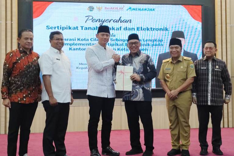 Selain mengakui Kota Cilegon sebagai pionir dalam implementasi sertipikat elektronik, AHY juga turut menyerahkan 53 bidang sertipikat tanah wakaf kepada masyarakat Banten dan 43 bidang sertipikat elektronik kepada perwakilan masyarakat Kota Cilegon.