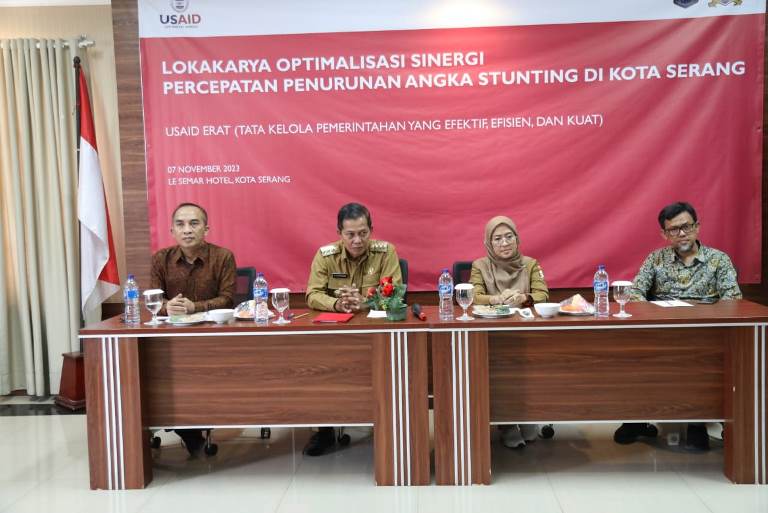 SERANG, SEBARAYA.COM – Walikota Serang, Syafrudin, terus berupaya menurunkan angka stunting di Kota Serang. Hal ini dibuktikan dengan kehadirannya dalam kegiatan Lokakarya Optimalisasi Sinergi Percepatan Penurunan Angka Stunting di Kota Serang yang diselenggarakan oleh USAID ERAT bersama BAPPEDA Kota Serang, Selasa (7/11/2023).